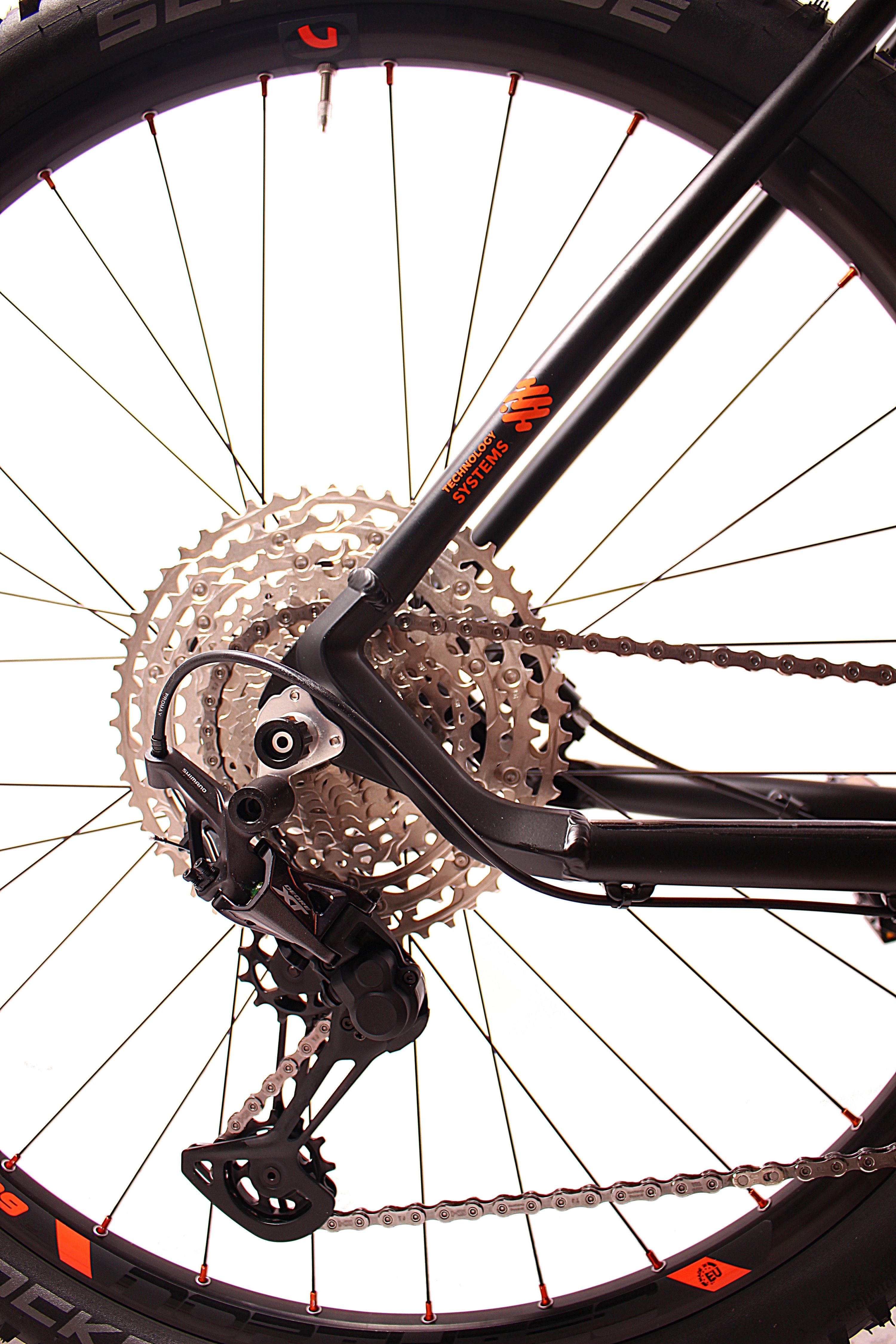 Profesjonalny, rajdowy rower MTB 29". Lekka hydroformowana rama aluminiowa o sportowej geometrii, główce tapered, posiadająca system: Cable Inside Frame. Wyposażony w Hamulce Tarczowe hydrauliczne Shimano BR 201. Wysokiej klasy grupę napędowa Shimano Deore XT/DR . Solidne, wytrzymałe koła zbudowane na piastach Shimano XT M-8110 wzmacnianych obręczach, szprychach Sapim Leader i oponach Schwalbe Rocket Ron Performance 29x2.25 gwarantują dużą wytrzymałość i bezpieczną jazdę w terenie. Powietrzny amortyzator SR Suntour: XCR 32 RLR-Air 29 100m z regulacją tłumienia i manetką blokady skoku z kierownicy, zapewni optymalne tłumienie drgań i wstrząsów na górskich trasach.