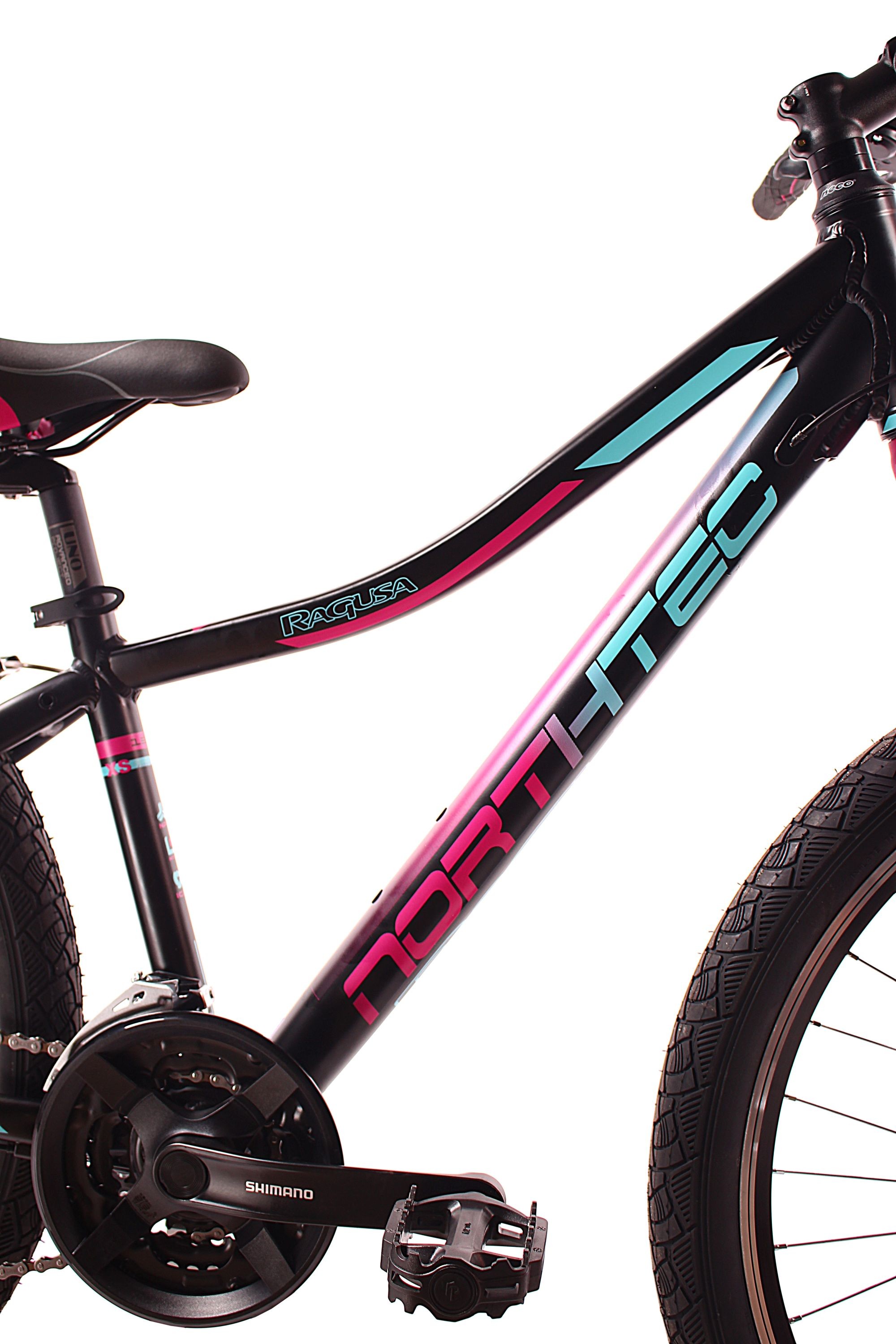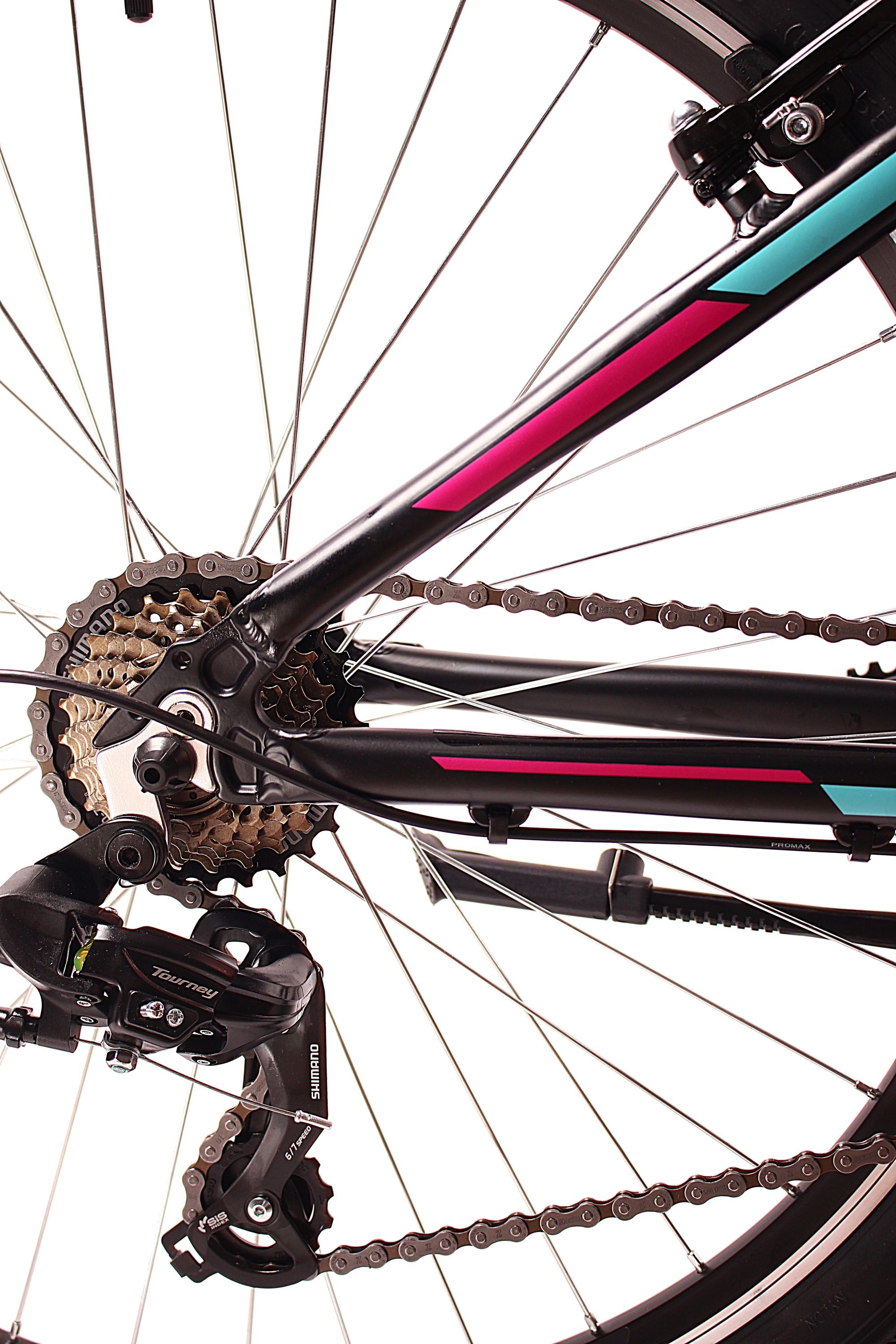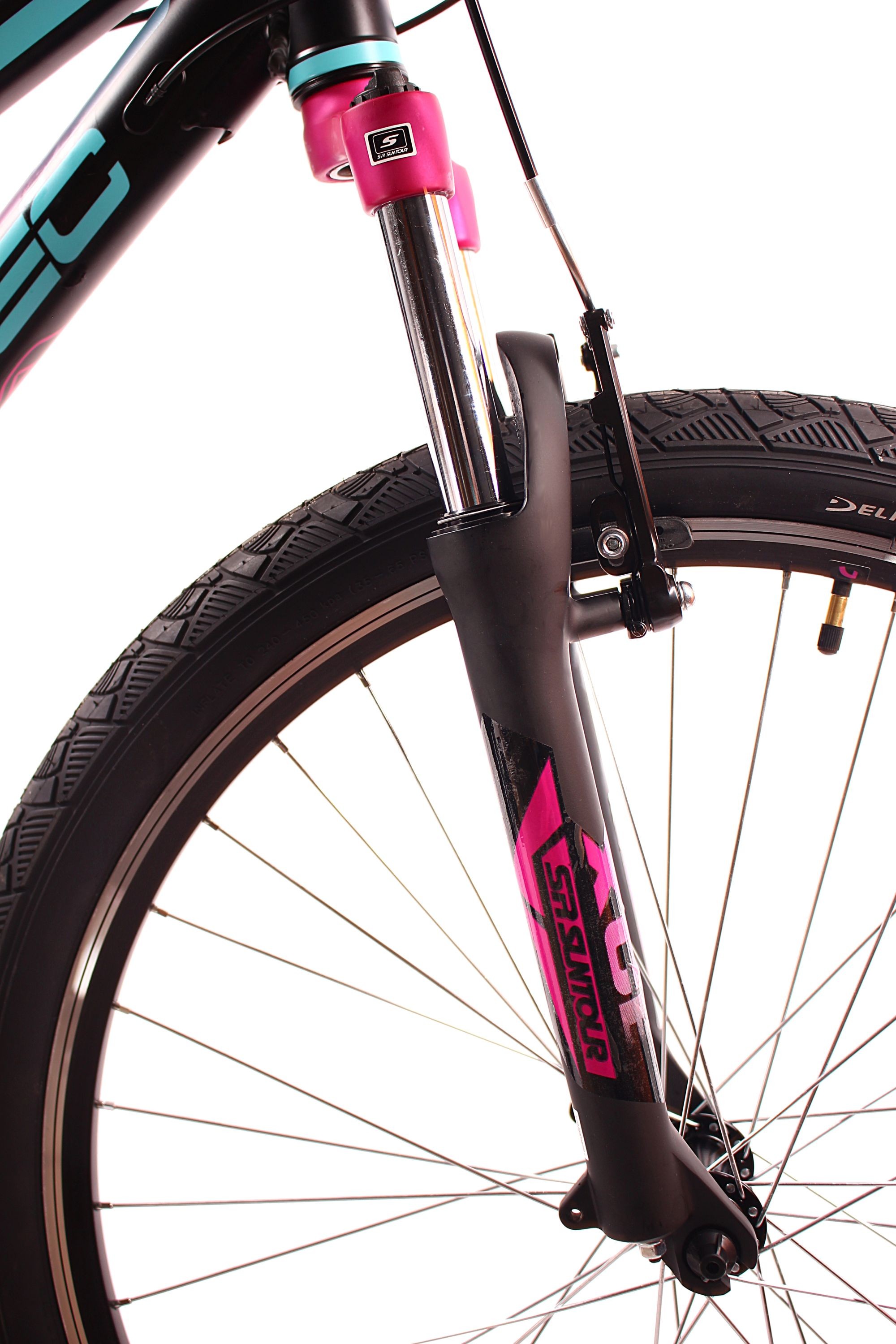 Lekka rama aluminiowa. Niezawodny napęd Shimano Tourney 3x7. Amortyzator Spiner 100mm z regulacją skoku. Solidne, wzmacniane koła na piastach Alu łożyska maszynowe, szprychach Sapim..