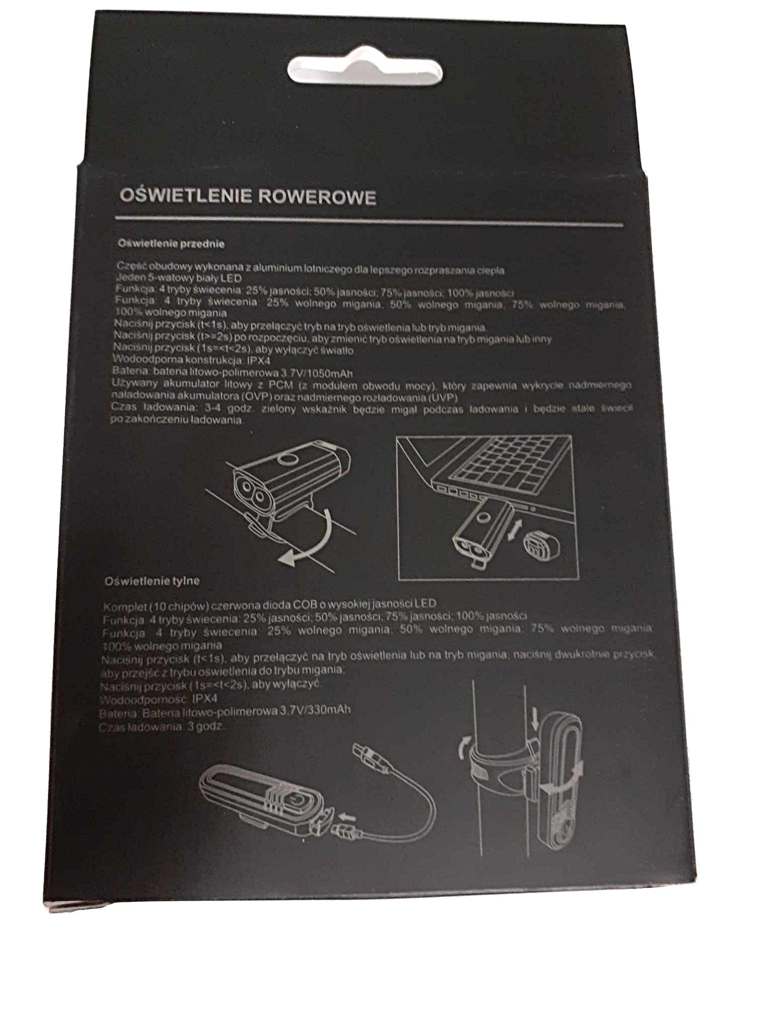 Zestaw oświetleniowy przód + tył JY-7066 + JY-6056T, to wysokiej jakości lampy, gwarantujące widoczność oraz oświetlenie drogi nawet w największej ciemności. Przednia lampa wykonana jest częściowo z aluminium lotniczego, dzięki czemu lepiej rozprasza ciepło. Montowana na kierownicy za pomocą gumowego paska. Ładować ją należy poprzez wpięcie do portu USB np. w power banku, tablecie itd. posiada moc aż 400 lumenów. Z kolei tylna lampa LED o wydłużonej długości świecenia, montowana na wsporniku siodła za pomocą gumowego paska ładowana jest za pomocą kabla USB. Obie lampy posiadają poziom wodoodporności IPX4 co gwarantuje wysoką odporność na wilgoć.