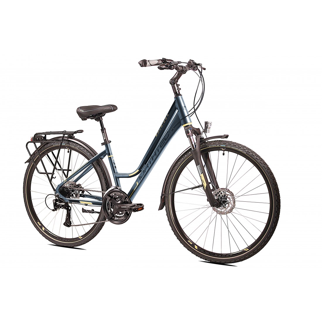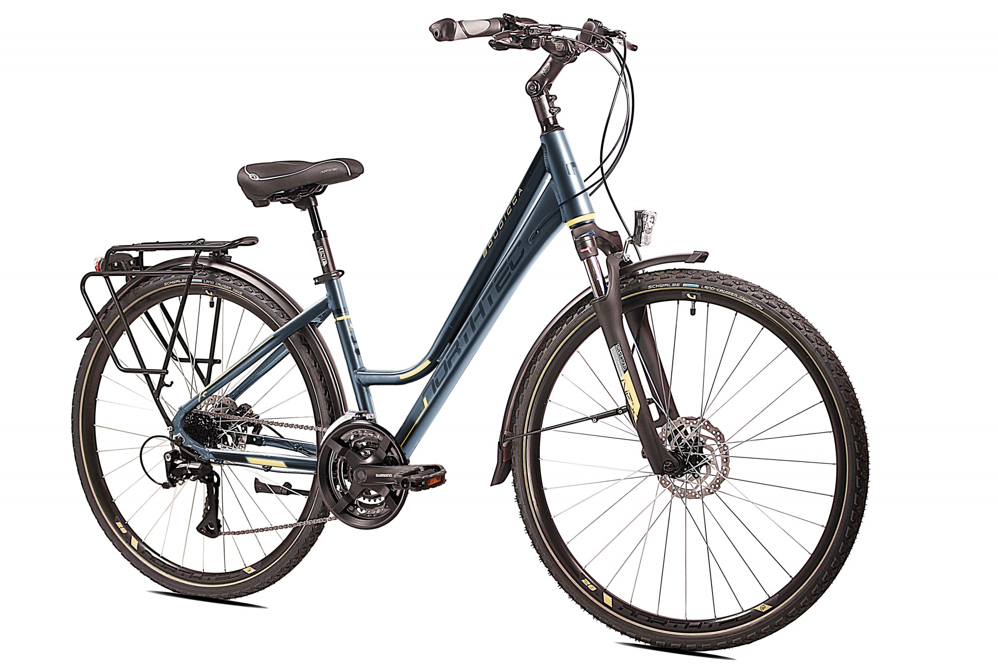 Nowy model roweru trekkingowego, wyposażony w hamulce Tarczowe hydrauliczne Shimano. Lekka hydroformowana rama aluminiowa o komfortowej geometrii, posiadająca system: Cable Inside Frame . Napęd Shimano Acera/Altus 3x8. Amortyzator Suntour NEX HLO DS 700C 63mm z regulacją i blokadą skoku zapewni optymalne tłumienie drgań I wstrząsów. Solidne, wzmacniane koła, zbudowane na piastach Alu Łożyska maszynowe 32H QR, szprychach Sapim oraz oponach Schwalbe Land Cruiser z wkładką antyprzebiciową. Amortyzowany wspornik siodła, szerokie wygodne siodełko elastomerowe. W podstawowym wyposażeniu zamontowany jest bagażnik aluminiowy, oświetlenie ledowe bateryjne, solidne błotniki SKS oraz podpórka.