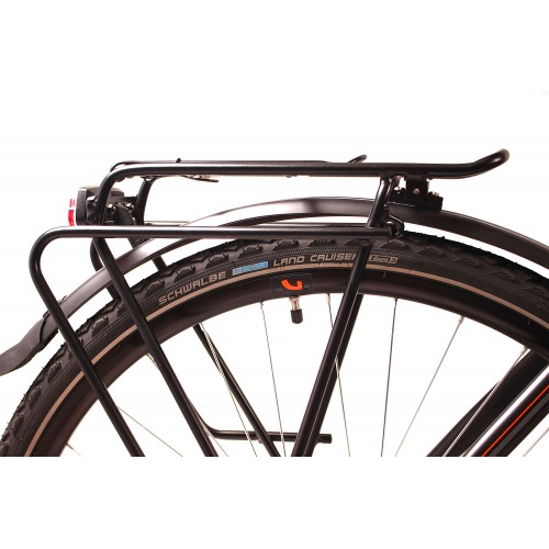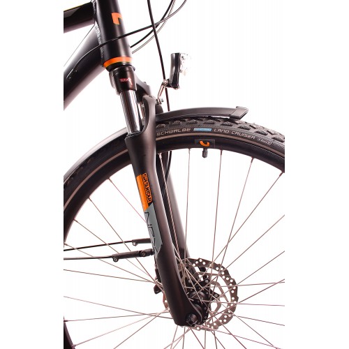 Nowy model roweru trekkingowego, dla wymagających cyklistów, pokonujących wielokilometrowe trasy w różnorodnym terenie. Wyposażony w hamulce Tarczowe hydrauliczne gemma. Lekka hydroformowana rama aluminiowa o komfortowej geometrii, posiadająca system: Cable Inside Frame . Niezawodna grupa napędowa Shimano Acera/Altus 3x8. Amortyzator NEX HLO DS 700C 63mm z regulacją i blokadą skoku zapewni optymalne tłumienie drgań I wstrząsów. Solidne, wzmacniane koła, zbudowane na piastach Alu Łożyska maszynowe 32H QR, szprychach Sapim, oraz oponach Schwalbe Land Cruiser z wkładką antyprzebiciową. Amortyzowany wspornik siodła, szerokie wygodne siodełko elastomerowe. W podstawowym wyposażeniu zamontowany jest bagażnik aluminiowy, oświetlenie ledowe bateryjne, solidne błotniki SKS oraz podpórkę.