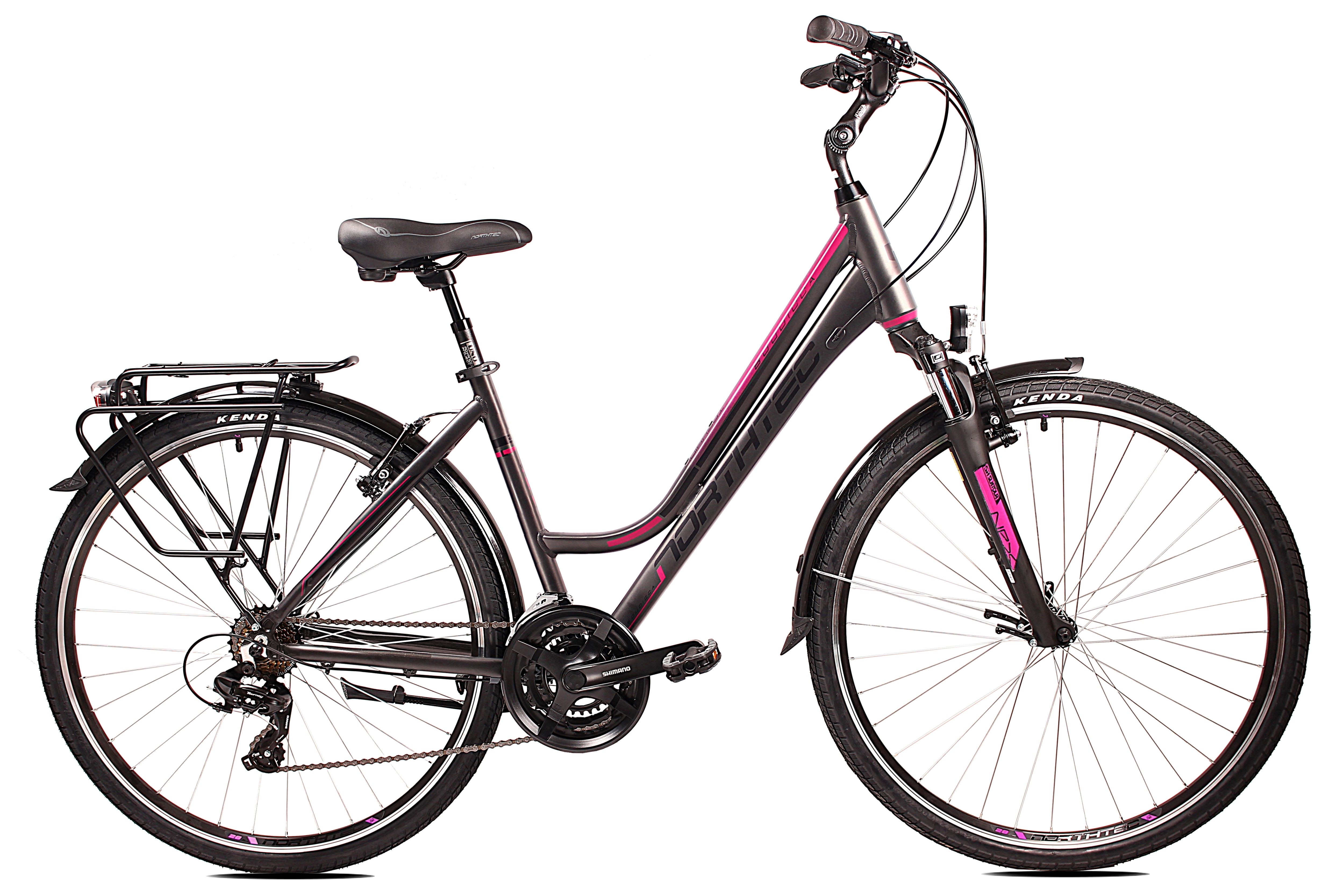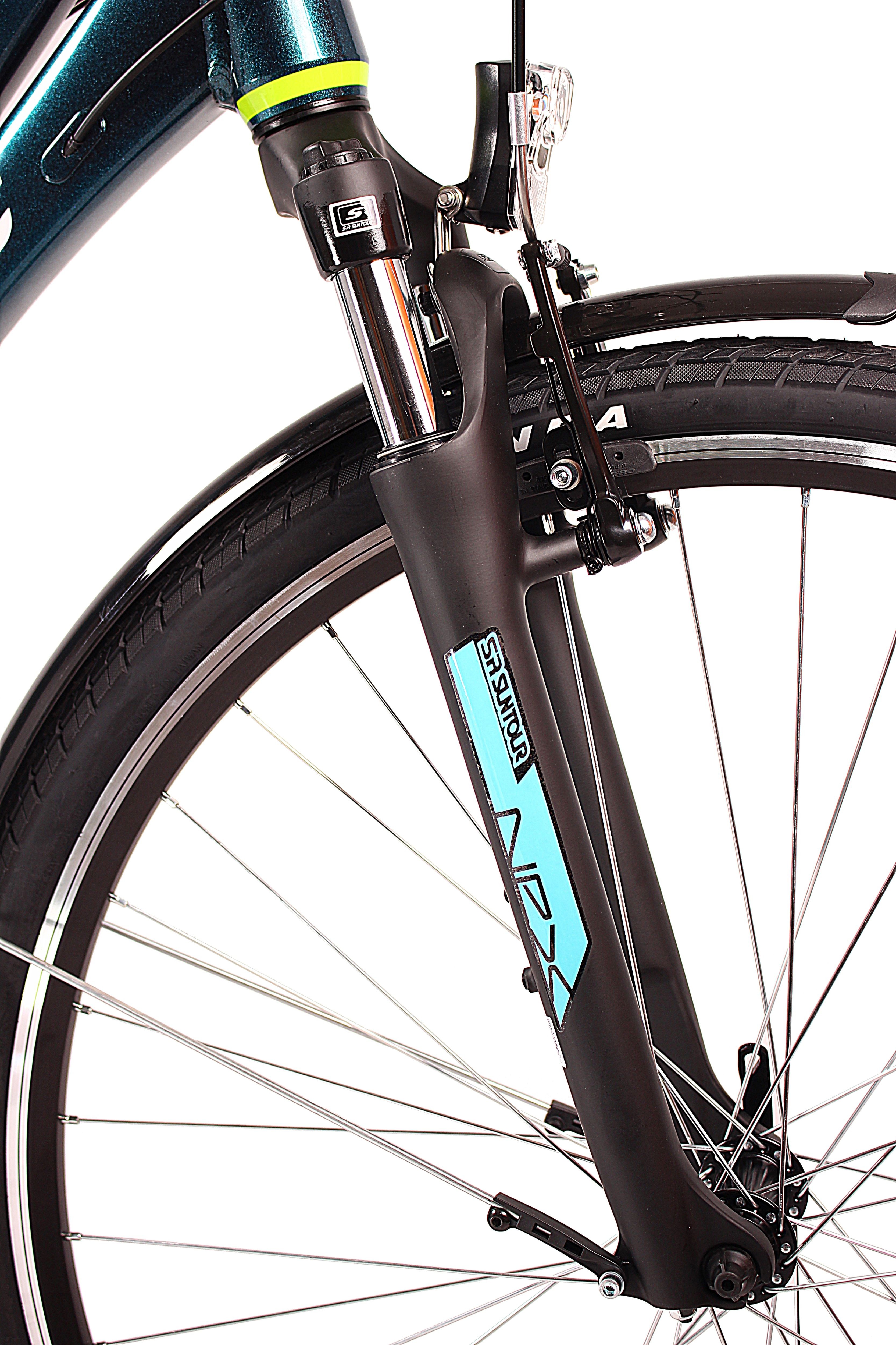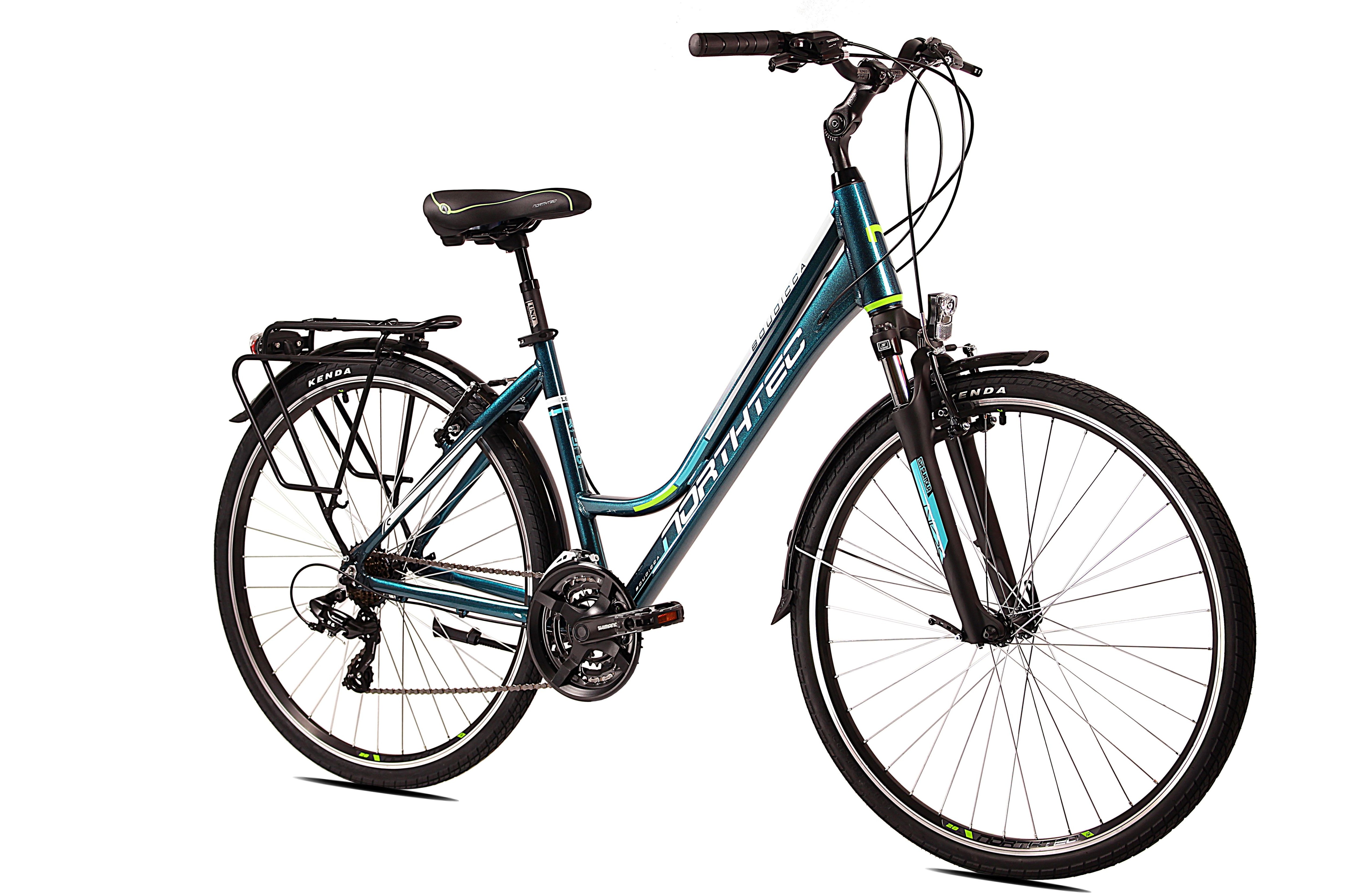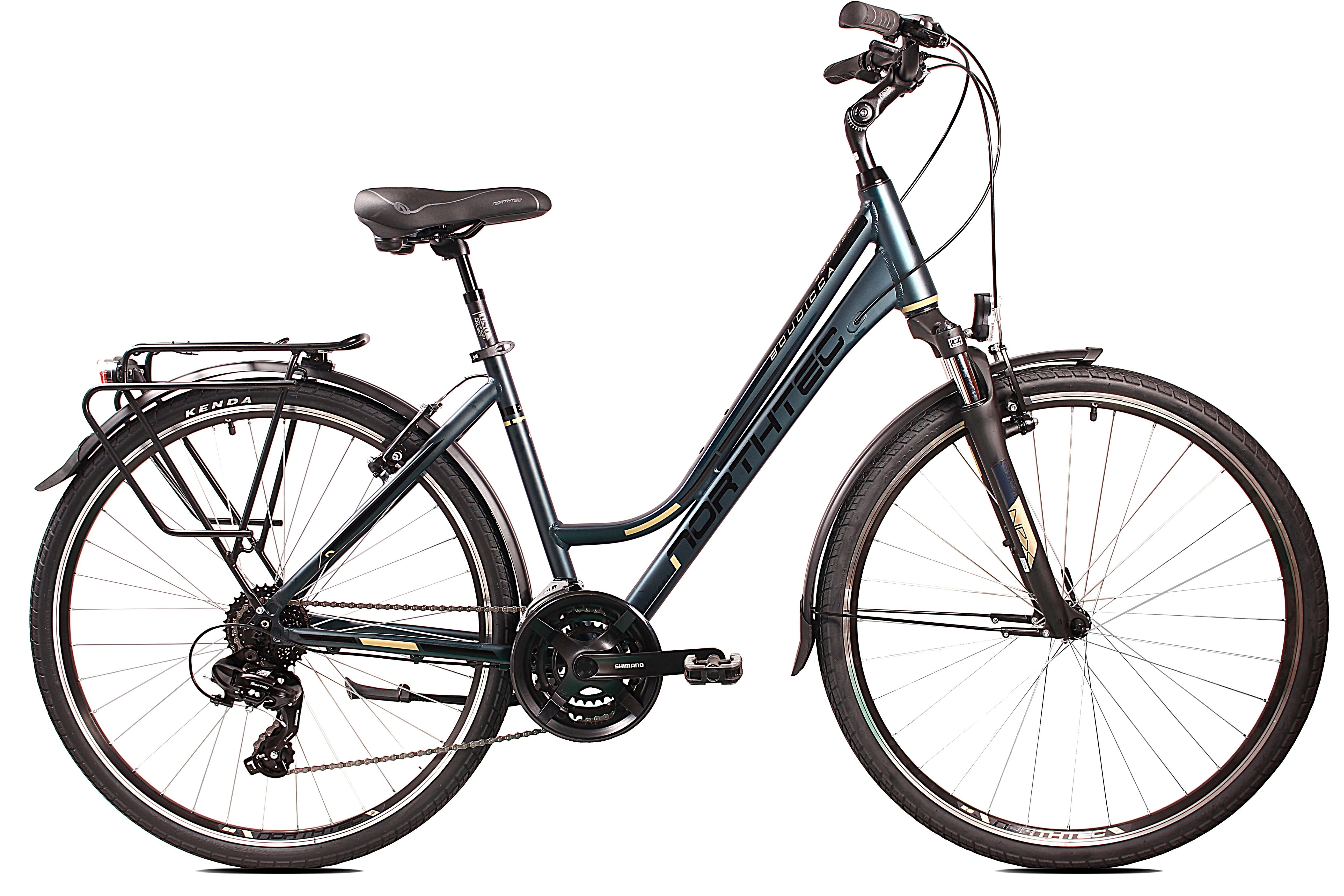 Solidny, wytrzymały rower trekkingowy dla amatorek turystyki rowerowej. Lekka hydroformowana rama aluminiowa o komfortowej geometrii, posiadająca system: Cable Inside Frame. Niezawodna grupa napędowa Shimano 3x7. Amortyzator Suntour NEX P 700C 63mm z regulacją skoku. Solidne, wzmacniane koła, zbudowane na piastach o łożyskach maszynowych, szprychach Sapim. Amortyzowany wspornik siodła, szerokie wygodne siodełko elastomerowe. W podstawowym wyposażeniu zamontowany jest bagażnik aluminiowy, oświetlenie ledowe bateryjne, solidne błotniki SKS oraz podpórka.