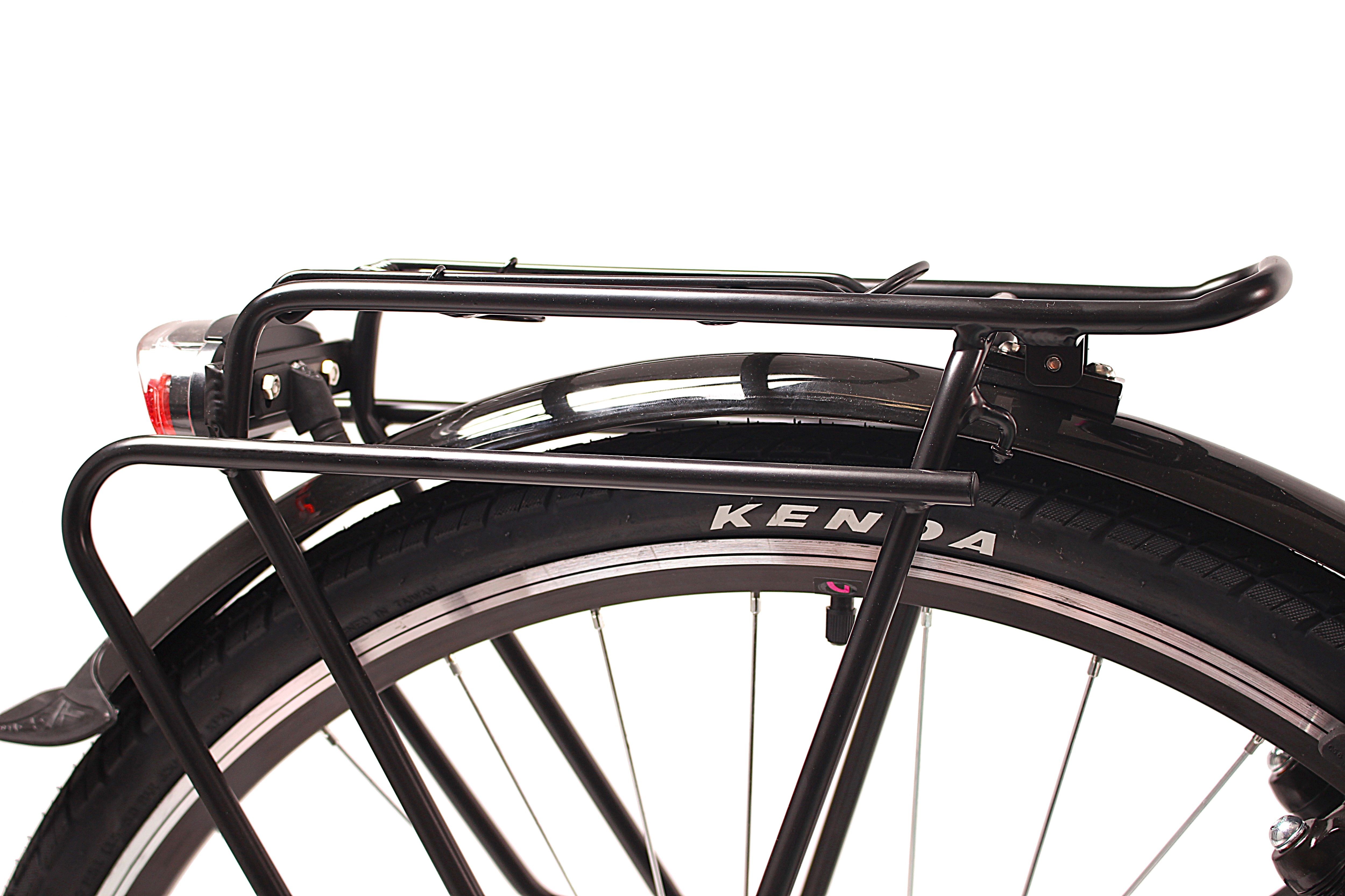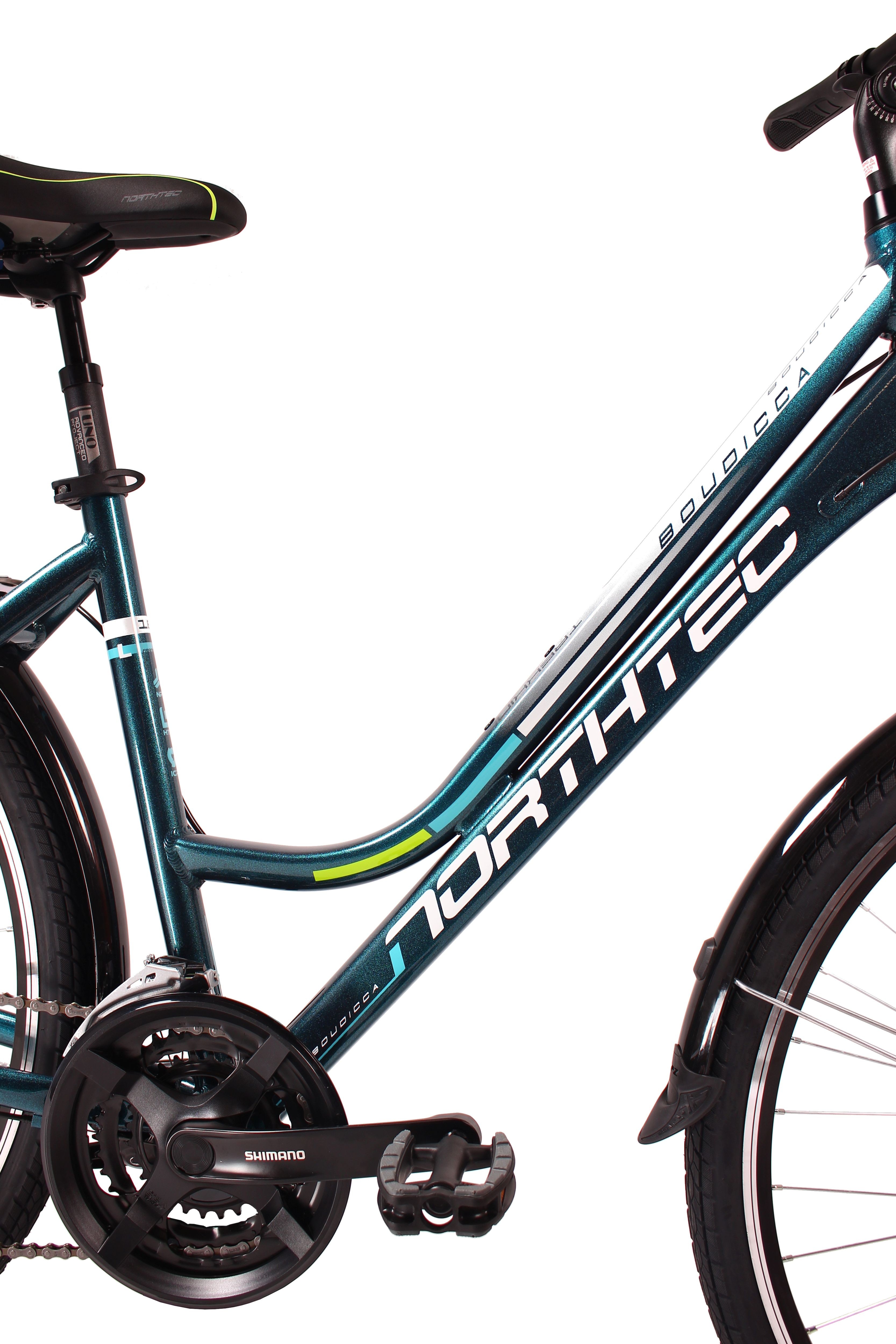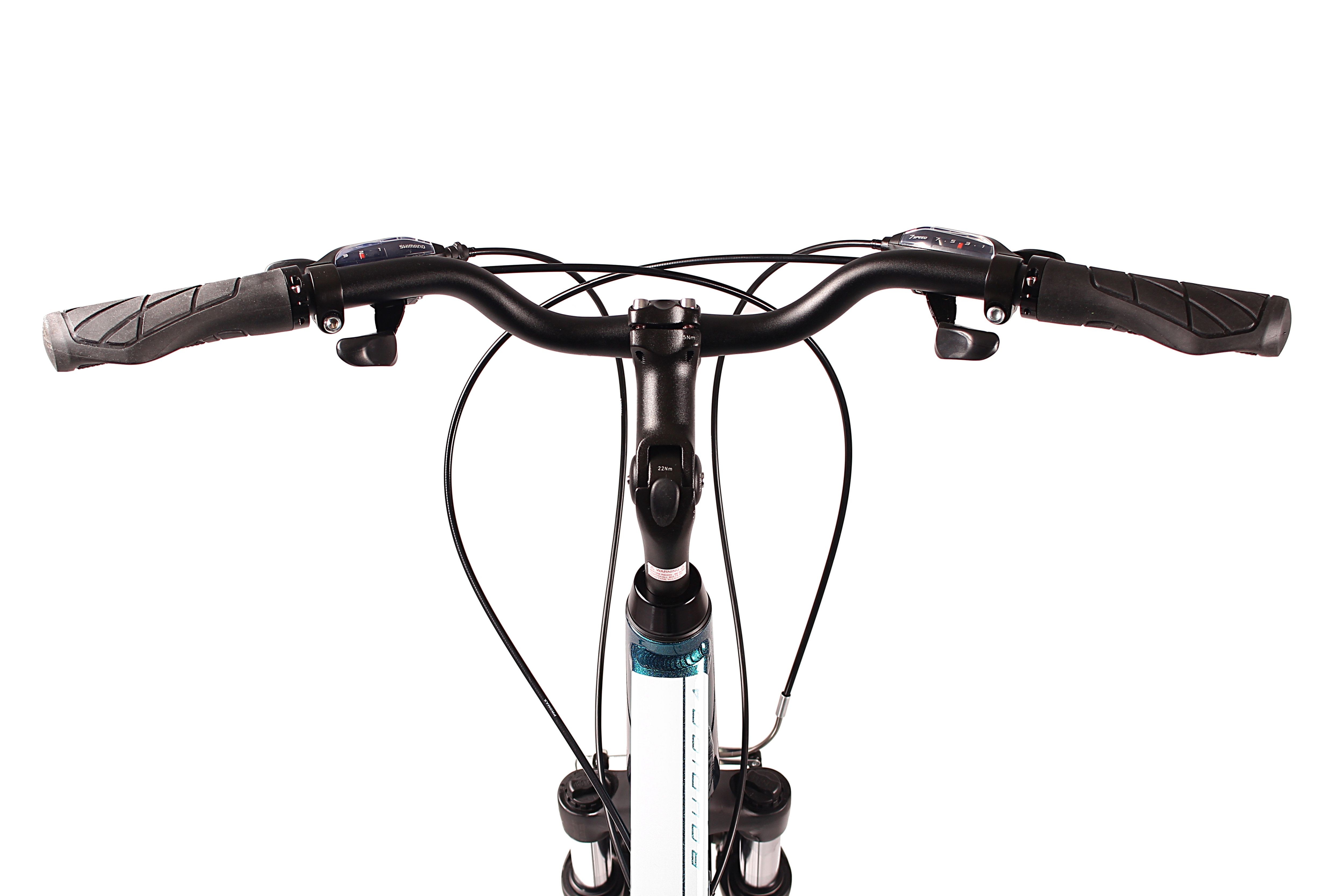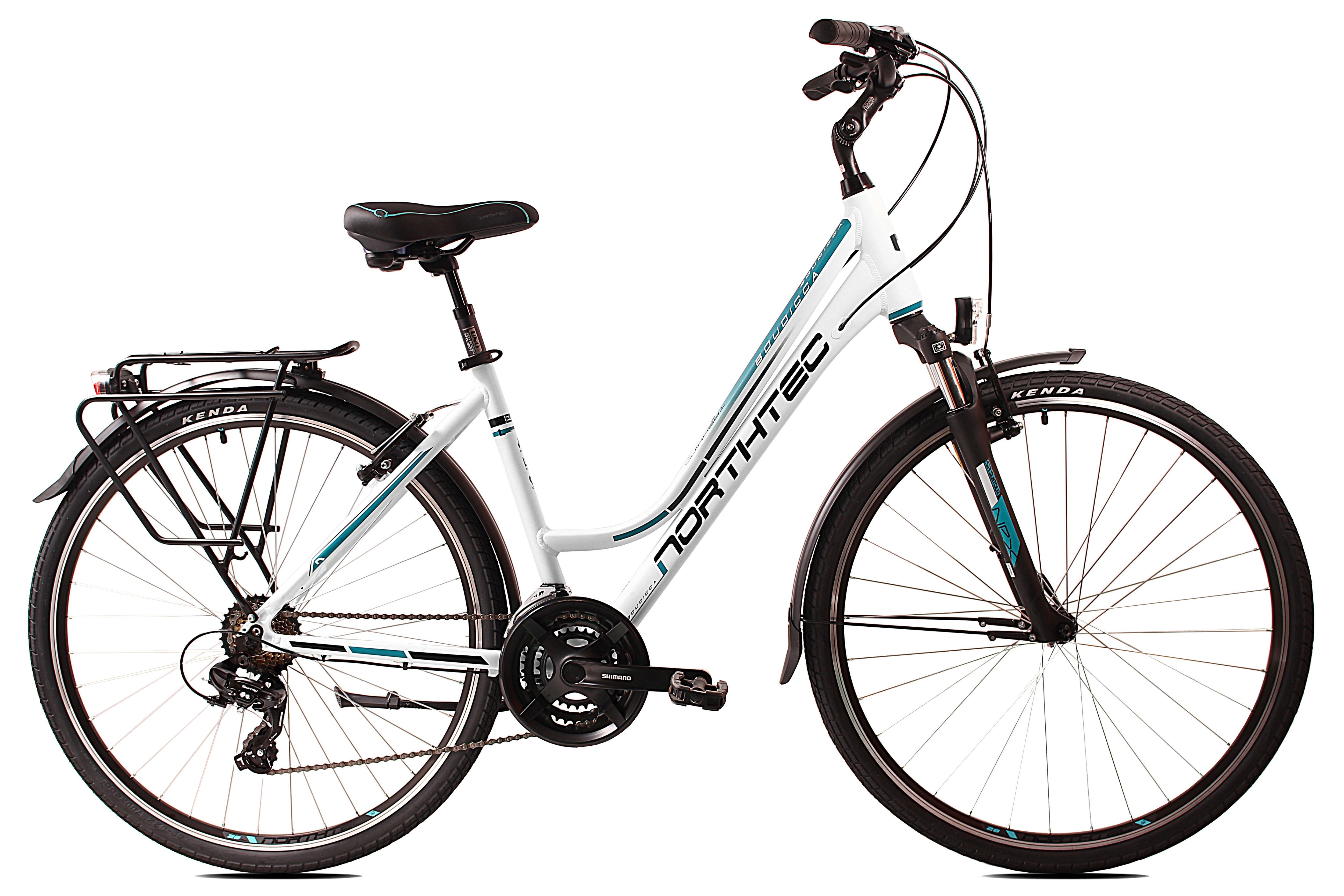 Solidny, wytrzymały rower trekkingowy dla amatorek turystyki rowerowej. Lekka hydroformowana rama aluminiowa o komfortowej geometrii, posiadająca system: Cable Inside Frame. Niezawodna grupa napędowa Shimano 3x7. Amortyzator Suntour NEX P 700C 63mm z regulacją skoku. Solidne, wzmacniane koła, zbudowane na piastach o łożyskach maszynowych, szprychach Sapim. Amortyzowany wspornik siodła, szerokie wygodne siodełko elastomerowe. W podstawowym wyposażeniu zamontowany jest bagażnik aluminiowy, oświetlenie ledowe bateryjne, solidne błotniki SKS oraz podpórka.