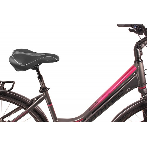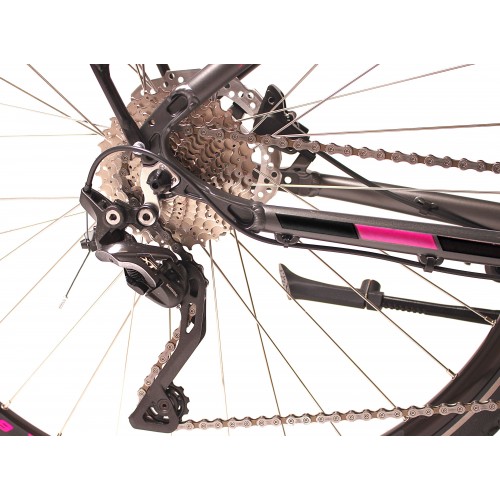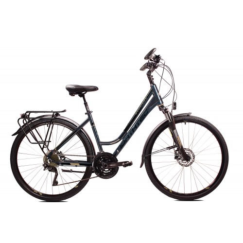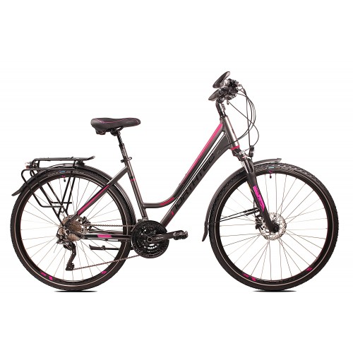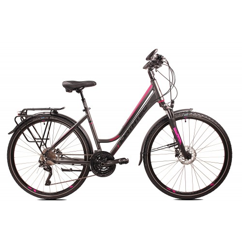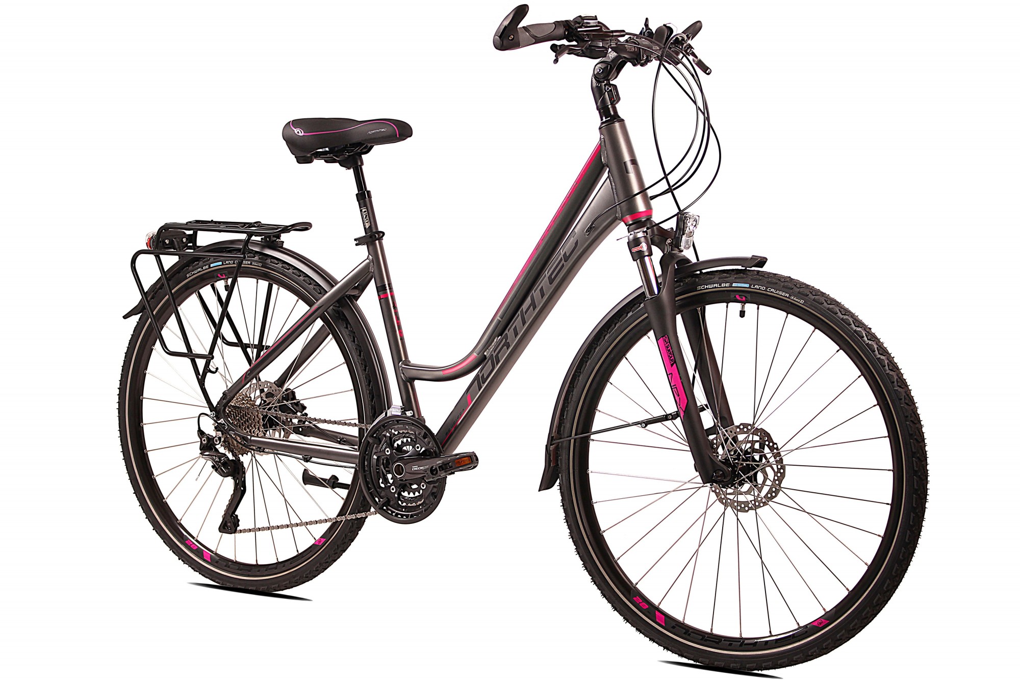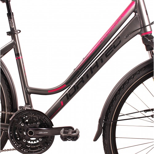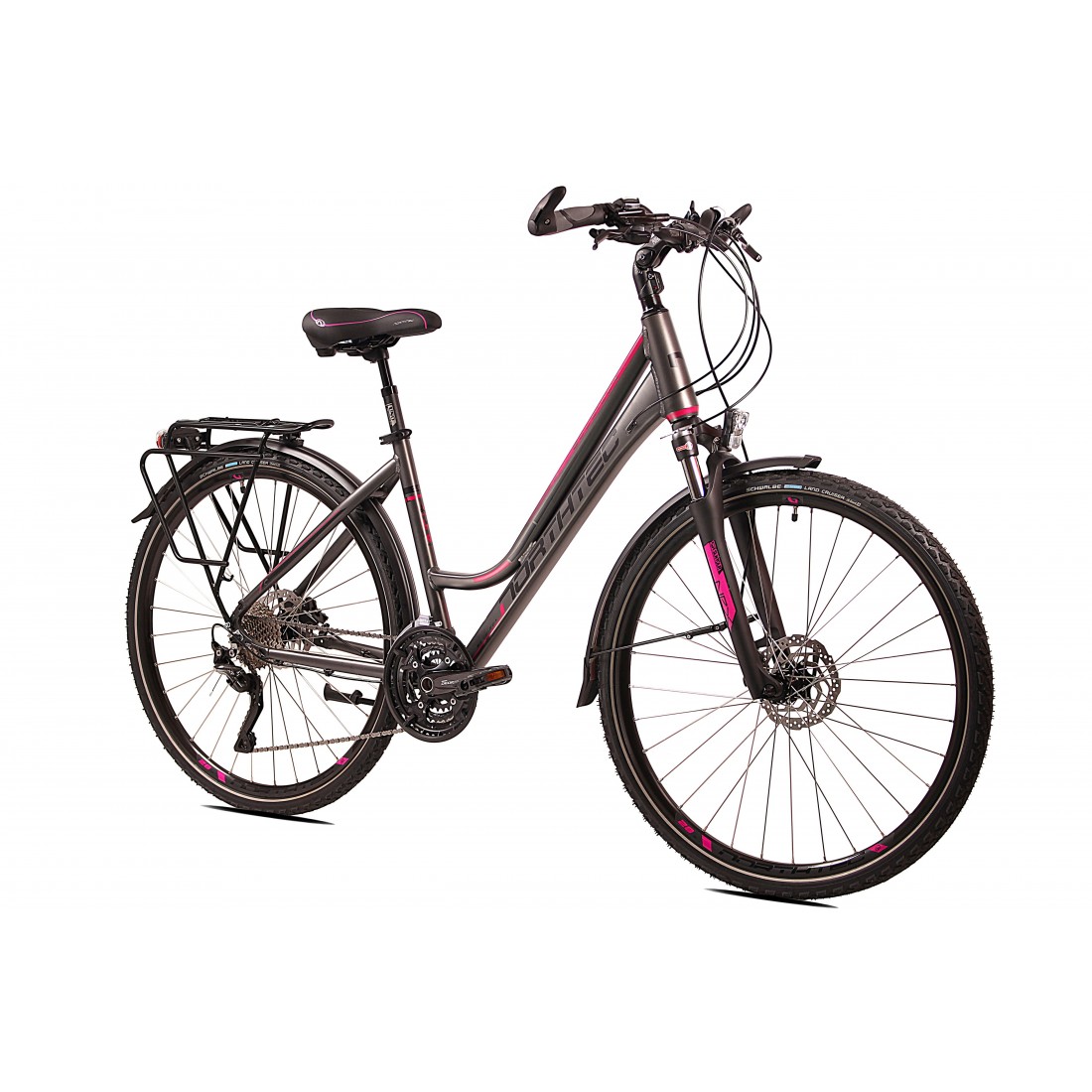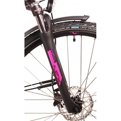 Profesjonalny rower trekkingowy, dla szukających najlepszego osprzętu, intensywnie jeżdżących cyklistek. Nowy model posiadający hydrauliczne hamulce tarczowe Shimano BR 201, zapewniające skuteczne hamowanie w każdych warunkach pogodowych. Lekka hydroformowana rama aluminiowa o komfortowej geometrii, posiadająca system: Cable Inside Frame. Pełna Profesjonalna grupa napędowa Shimano Deore 3x10 z tylną przerzutką Deore XT. Amortyzator NEX  RL DS 700C 63mm z regulacją i blokadą skoku z kierownicy zapewni optymalne tłumienie drgań i wstrząsów Solidne, wzmacniane koła, zbudowane na piastach Shimano HB-TX505, szprychach Sapim Leader oraz oponach Schwalbe Land Cruiser z wkładką antyprzebiciową. Amortyzowany wspornik siodła, szerokie wygodne siodełko elastomerowe. W podstawowym wyposażeniu zamontowany jest bagażnik aluminiowy, oświetlenie ledowe bateryjne, solidne błotniki SKS oraz podpórka