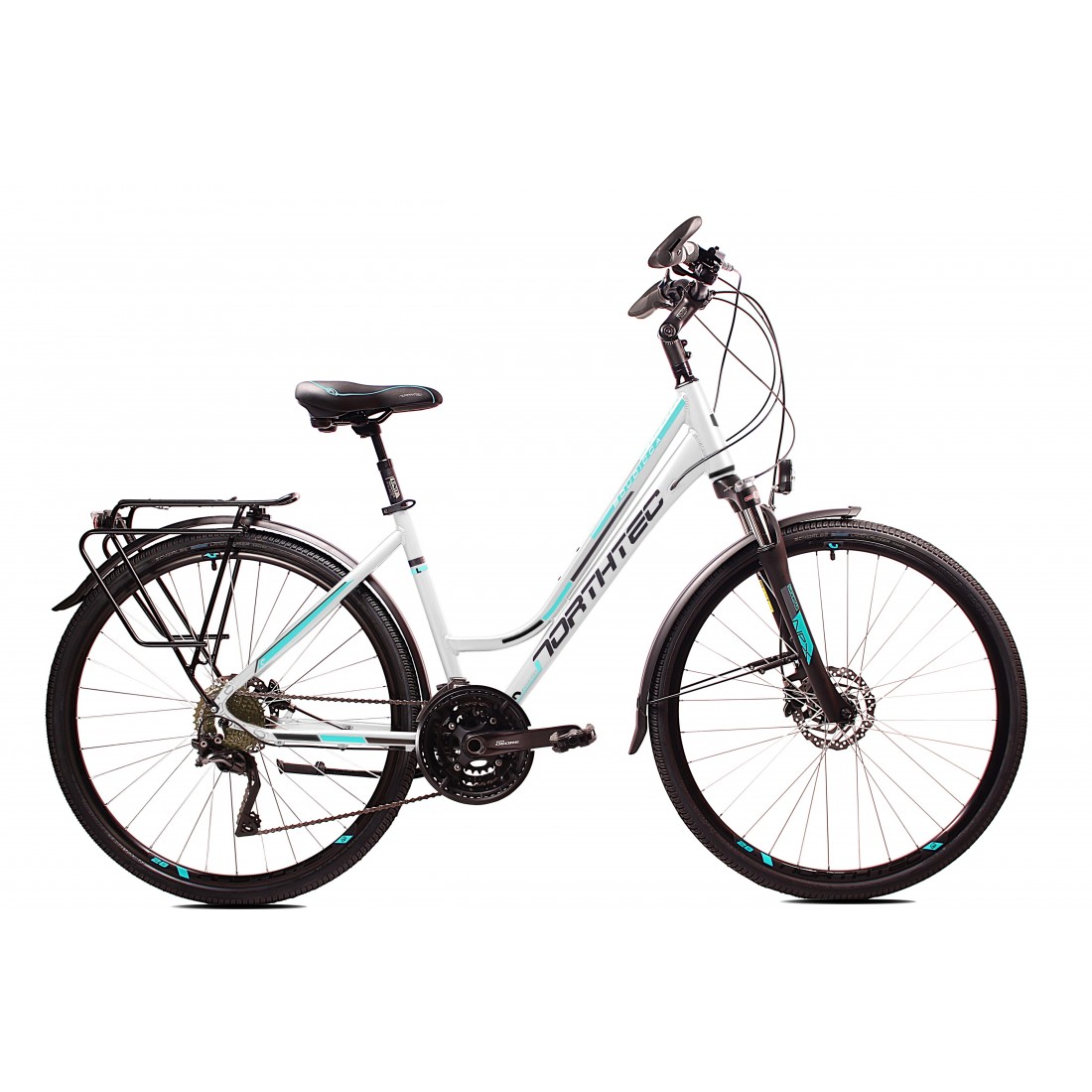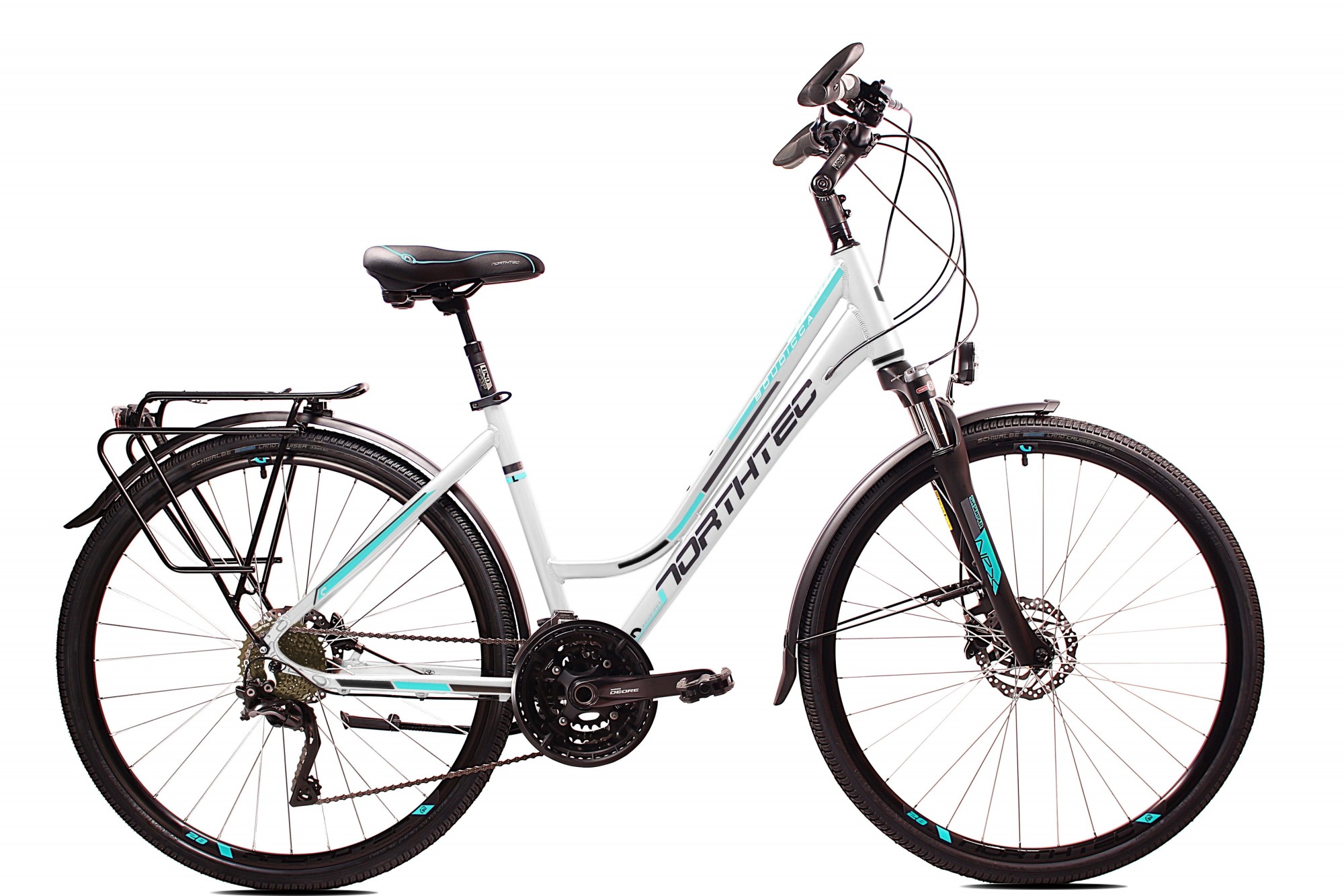 Profesjonalny rower trekkingowy, dla szukających najlepszego osprzętu, intensywnie jeżdżących cyklistek. Nowy model posiadający hydrauliczne hamulce tarczowe Shimano BR 201, zapewniające skuteczne hamowanie w każdych warunkach pogodowych. Lekka hydroformowana rama aluminiowa o komfortowej geometrii, posiadająca system: Cable Inside Frame. Pełna Profesjonalna grupa napędowa Shimano Deore 3x10 z tylną przerzutką Deore XT. Amortyzator NEX  RL DS 700C 63mm z regulacją i blokadą skoku z kierownicy zapewni optymalne tłumienie drgań i wstrząsów Solidne, wzmacniane koła, zbudowane na piastach Shimano HB-TX505, szprychach Sapim Leader oraz oponach Schwalbe Land Cruiser z wkładką antyprzebiciową. Amortyzowany wspornik siodła, szerokie wygodne siodełko elastomerowe. W podstawowym wyposażeniu zamontowany jest bagażnik aluminiowy, oświetlenie ledowe bateryjne, solidne błotniki SKS oraz podpórka