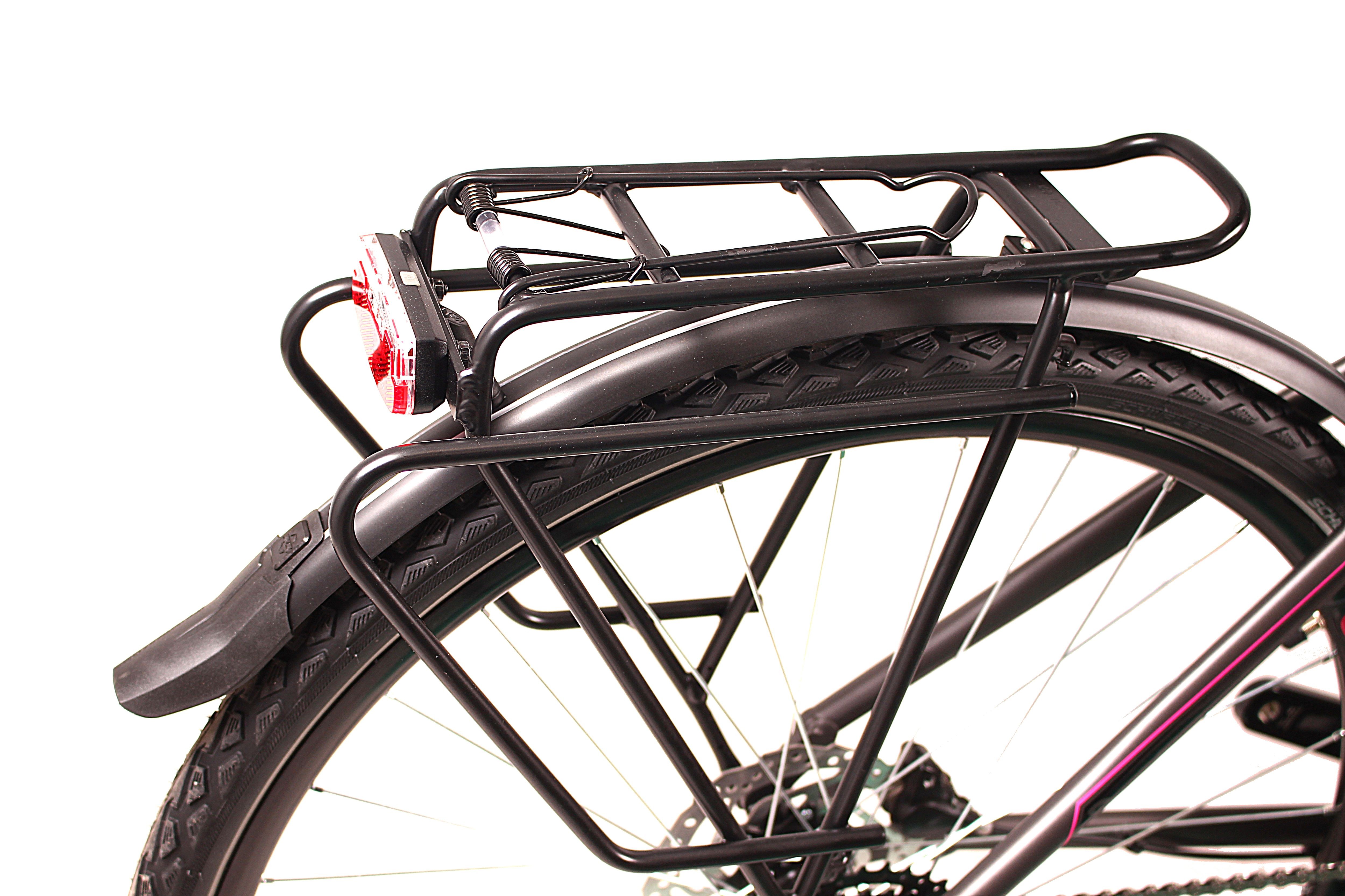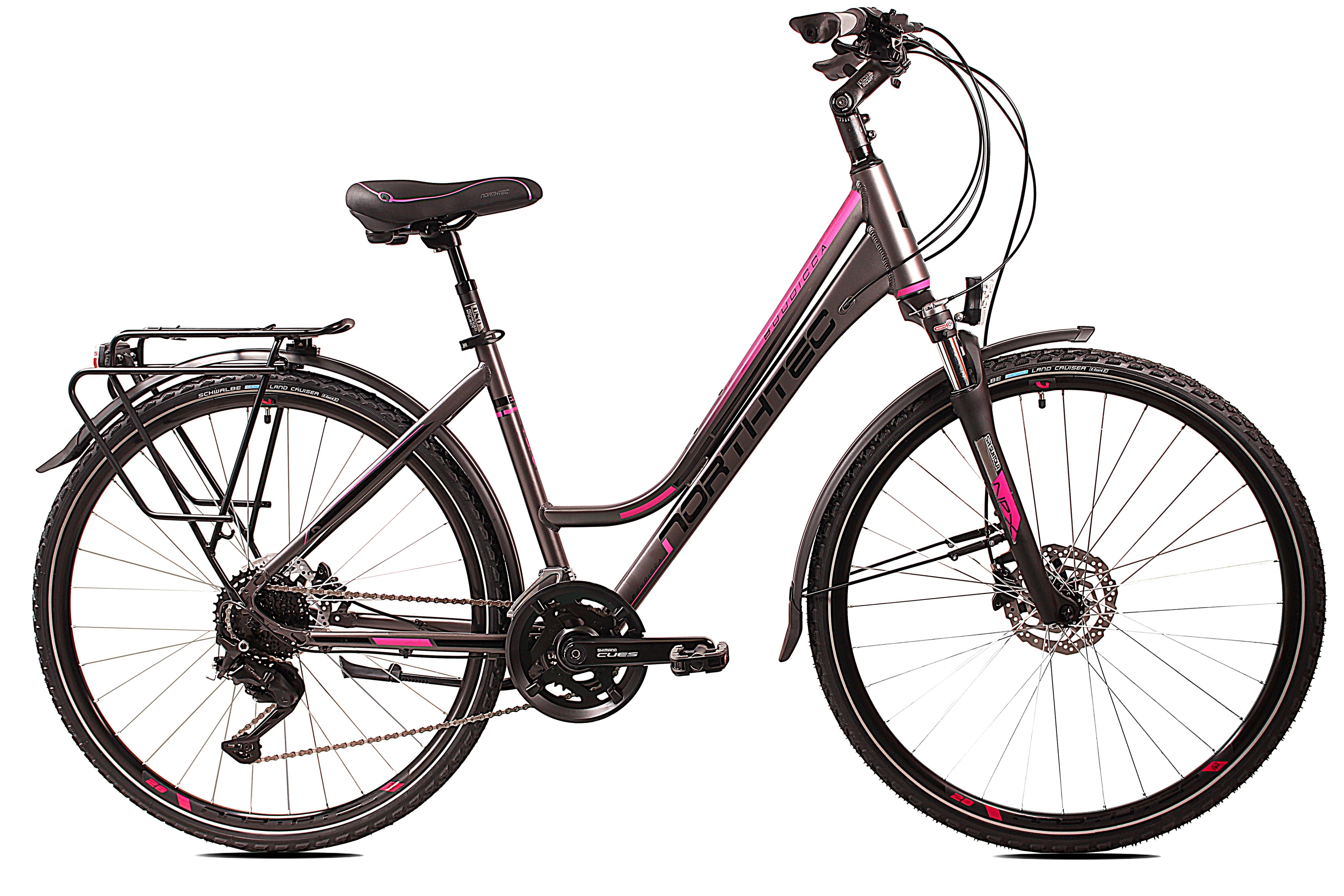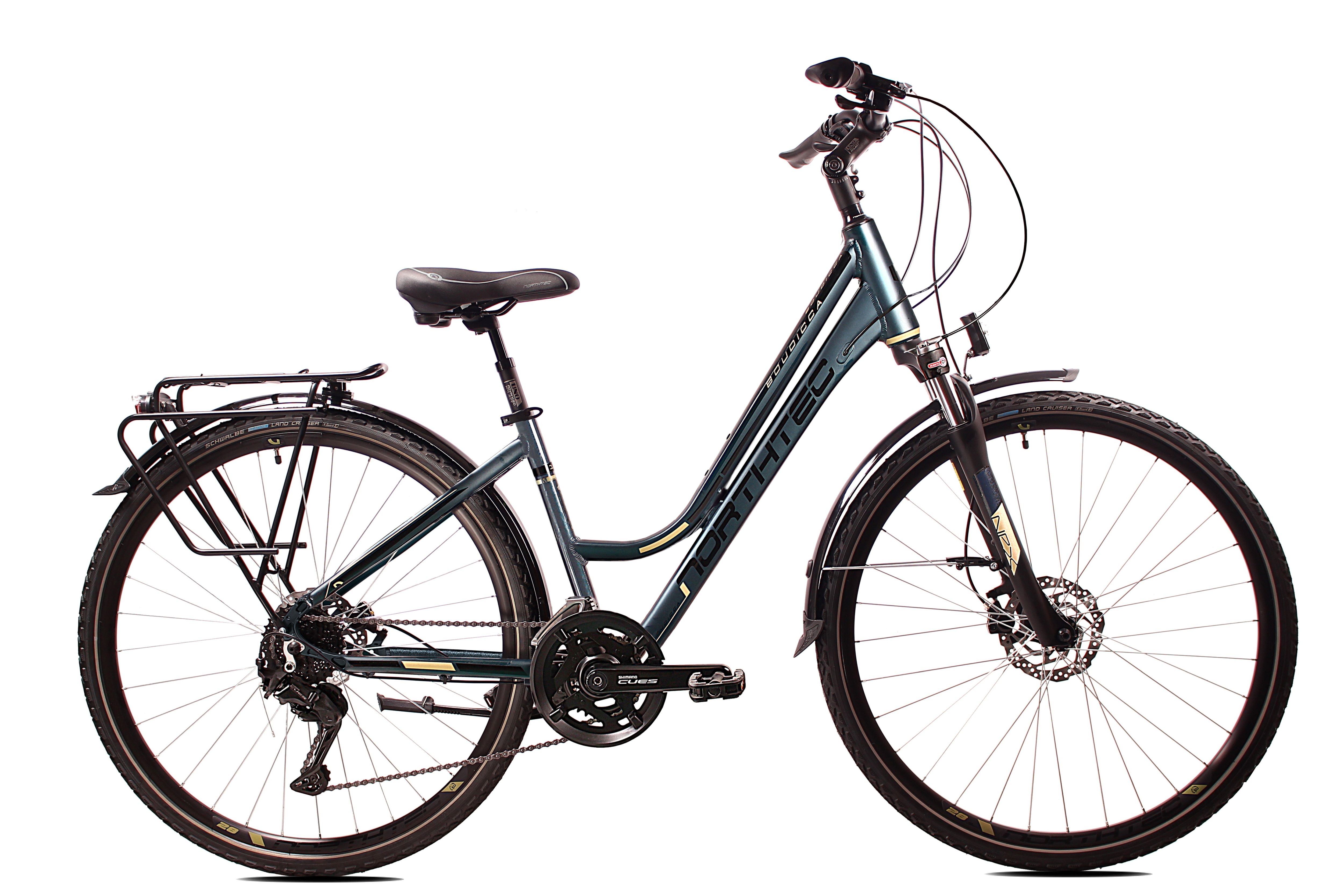 Nowy model roweru trekkingowego, dla wymagających cyklistów/ek, pokonujących wielokilometrowe trasy w różnorodnym terenie. Wyposażony w hamulce Tarczowe hydrauliczne Shimano BR 200. Lekka hydroformowana rama aluminiowa o komfortowej geometrii, posiadająca system: Cable Inside Frame . Niezawodna grupa napędowa Shimano CUES 2x9. Amortyzator NEX RL DS 700C 63mm z regulacją i blokadą skoku zapewni optymalne tłumienie drgań i wstrząsów. Solidne, wzmacniane koła, zbudowane na piastach Shimano FH-QC300 QR , szprychach Sapim oraz oponach Schwalbe Land Cruiser z wkładką antyprzebiciową. Amortyzowany wspornik siodła, szerokie wygodne siodełko elastomerowe. W podstawowym wyposażeniu zamontowany jest bagażnik aluminiowy, oświetlenie ledowe bateryjne, solidne błotniki SKS oraz podpórka.