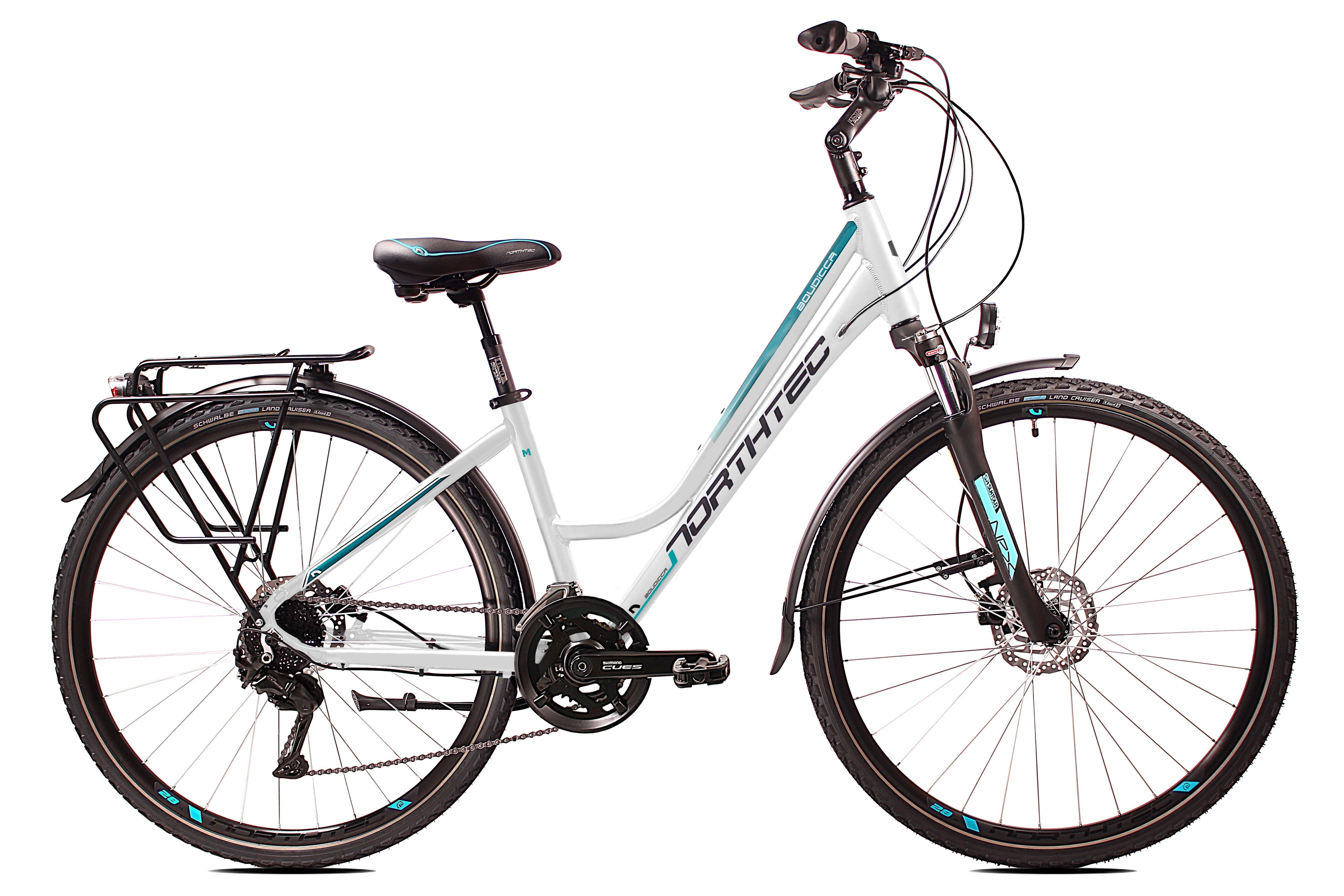 Nowy model roweru trekkingowego, dla wymagających cyklistów/ek, pokonujących wielokilometrowe trasy w różnorodnym terenie. Wyposażony w hamulce Tarczowe hydrauliczne Shimano BR 200. Lekka hydroformowana rama aluminiowa o komfortowej geometrii, posiadająca system: Cable Inside Frame . Niezawodna grupa napędowa Shimano CUES 2x9. Amortyzator NEX RL DS 700C 63mm z regulacją i blokadą skoku zapewni optymalne tłumienie drgań i wstrząsów. Solidne, wzmacniane koła, zbudowane na piastach Shimano FH-QC300 QR , szprychach Sapim oraz oponach Schwalbe Land Cruiser z wkładką antyprzebiciową. Amortyzowany wspornik siodła, szerokie wygodne siodełko elastomerowe. W podstawowym wyposażeniu zamontowany jest bagażnik aluminiowy, oświetlenie ledowe bateryjne, solidne błotniki SKS oraz podpórka.