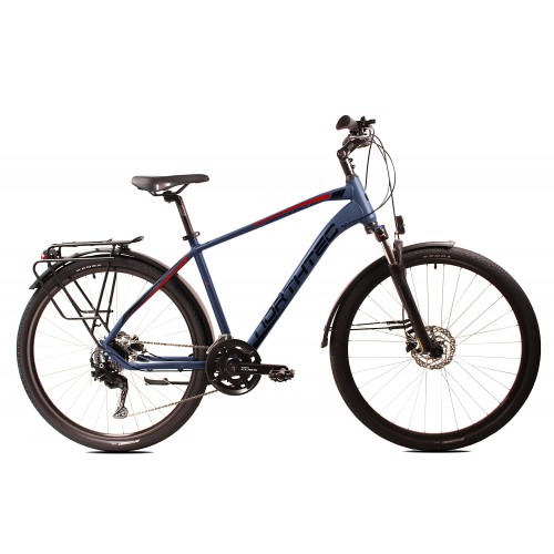 Wytrzymały rower o sportowej geometrii, stworzony zarówno do tras terenowych jak i jazdy po miejskich ulicach. Wyposażony w hamulce Tarczowe hydrauliczne Shimano. Lekka hydroformowana rama aluminiowa o komfortowej geometrii, posiadająca system: Cable Inside Frame. Napęd Shimano CUES 2x9. Amortyzator Suntour NVX HLO DS 700C 75mm z regulacją i blokadą skoku zapewni optymalne tłumienie drgań I wstrząsów. Solidne, wzmacniane koła, zbudowane na piastach Shimano HB-QC300 QR, szprychach Sapim. Amortyzowany wspornik siodła, szerokie wygodne siodełko elastomerowe. W podstawowym wyposażeniu zamontowany jest bagażnik aluminiowy, oświetlenie ledowe bateryjne, solidne błotniki SKS oraz podpórka.