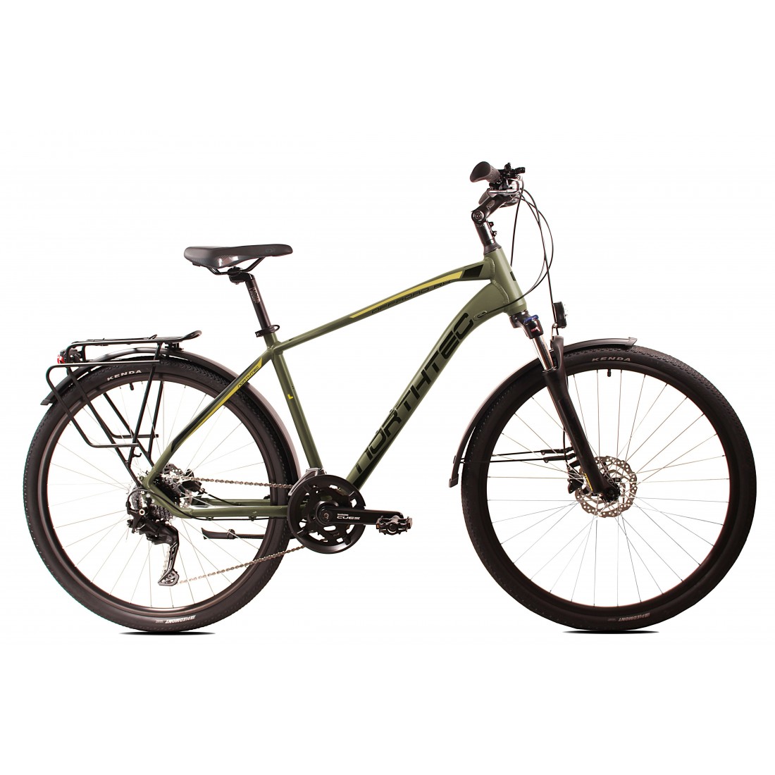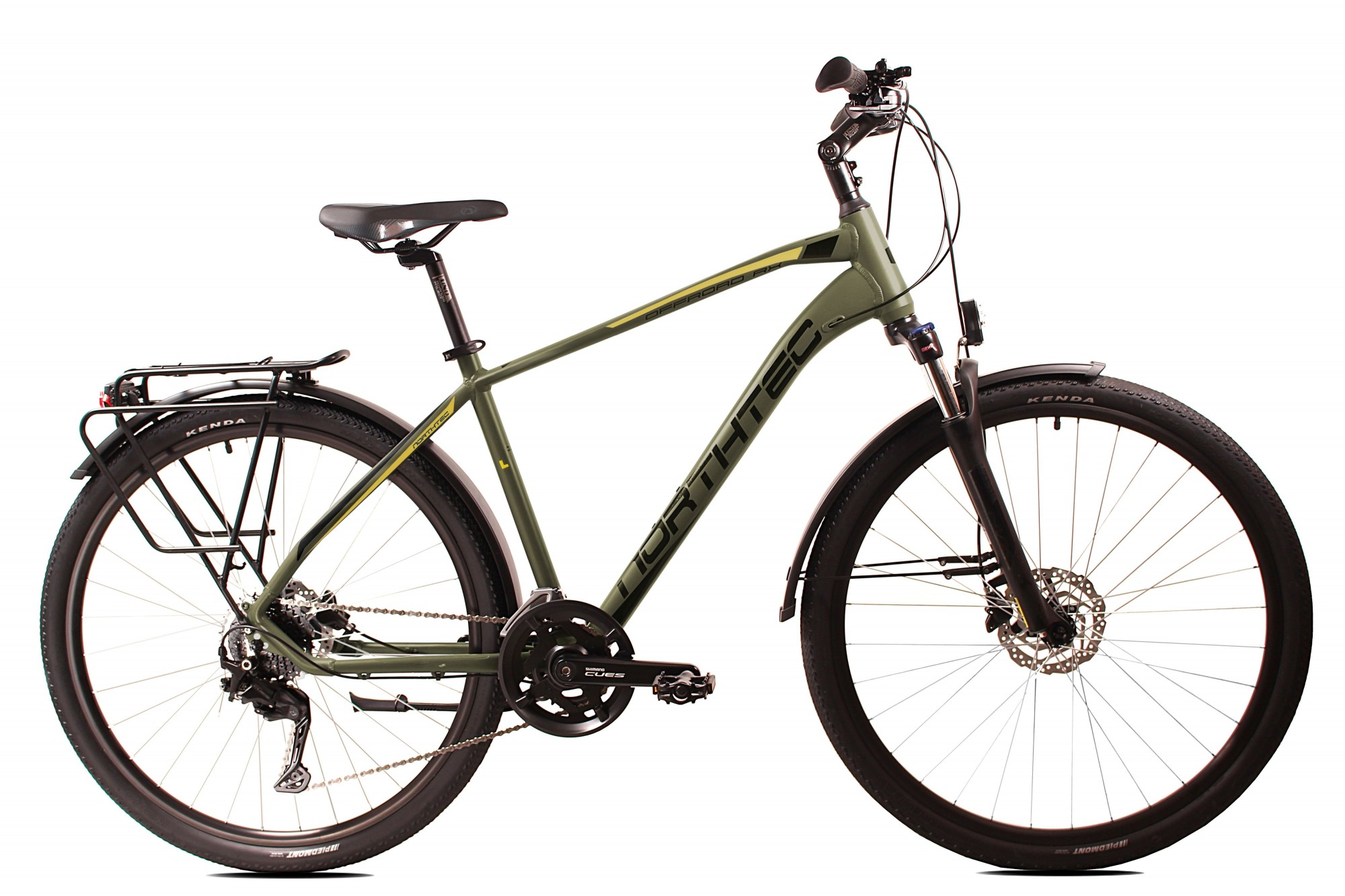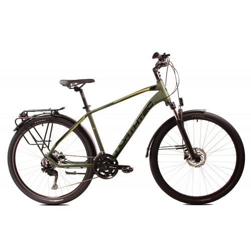 Wytrzymały rower o sportowej geometrii, stworzony zarówno do tras terenowych jak i jazdy po miejskich ulicach. Wyposażony w hamulce Tarczowe hydrauliczne Shimano. Lekka hydroformowana rama aluminiowa o komfortowej geometrii, posiadająca system: Cable Inside Frame. Napęd Shimano CUES 2x9. Amortyzator Suntour NVX HLO DS 700C 75mm z regulacją i blokadą skoku zapewni optymalne tłumienie drgań I wstrząsów. Solidne, wzmacniane koła, zbudowane na piastach Shimano HB-QC300 QR, szprychach Sapim. Amortyzowany wspornik siodła, szerokie wygodne siodełko elastomerowe. W podstawowym wyposażeniu zamontowany jest bagażnik aluminiowy, oświetlenie ledowe bateryjne, solidne błotniki SKS oraz podpórka.