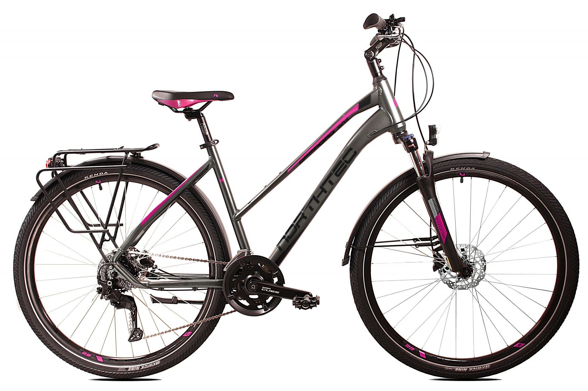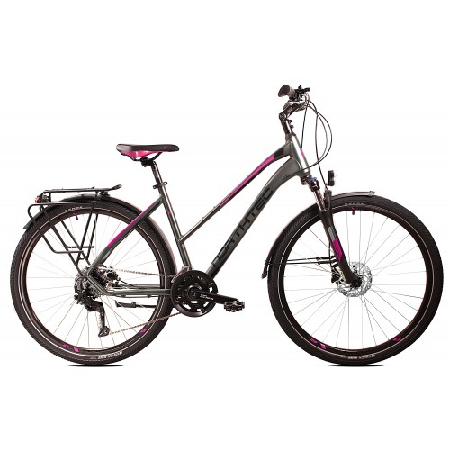 Wytrzymały rower o sportowej geometrii, stworzony zarówno do tras terenowych jak i jazdy po miejskich ulicach. Wyposażony w hamulce Tarczowe hydrauliczne Shimano. Lekka hydroformowana rama aluminiowa o komfortowej geometrii, posiadająca system: Cable Inside Frame. Napęd Shimano CUES 2x9. Amortyzator Suntour NVX HLO DS 700C 75mm z regulacją i blokadą skoku zapewni optymalne tłumienie drgań I wstrząsów. Solidne, wzmacniane koła, zbudowane na piastach Shimano HB-QC300 QR, szprychach Sapim. Amortyzowany wspornik siodła, szerokie wygodne siodełko elastomerowe. W podstawowym wyposażeniu zamontowany jest bagażnik aluminiowy, oświetlenie ledowe bateryjne, solidne błotniki SKS oraz podpórka.