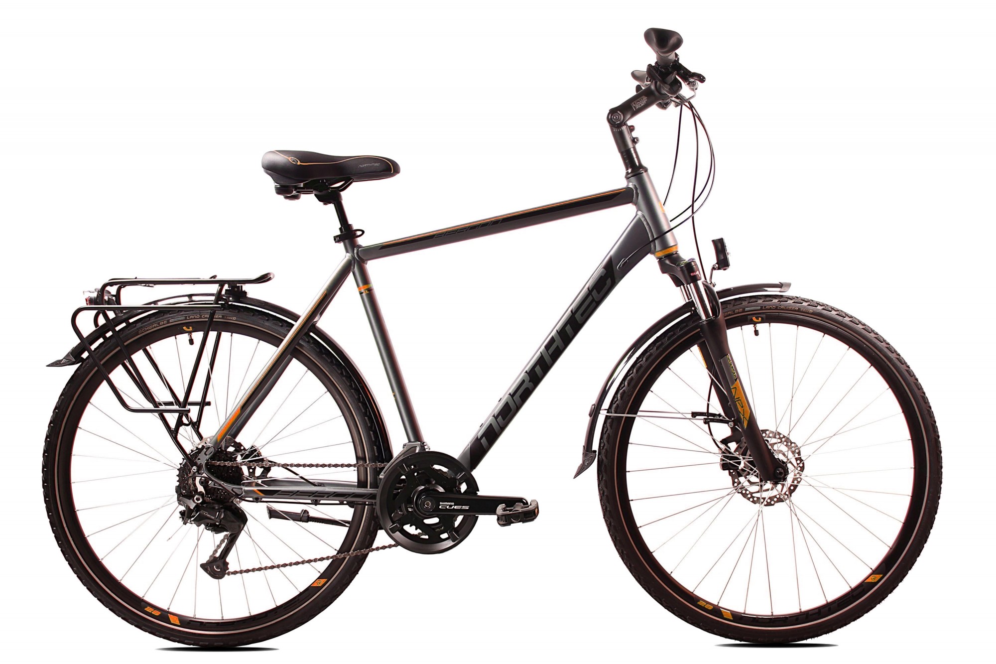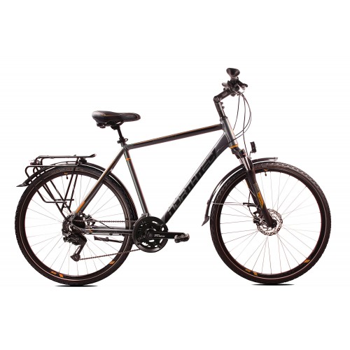Nowy model roweru trekkingowego, dla wymagających cyklistów, pokonujących wielokilometrowe trasy w różnorodnym terenie. Wyposażony w hamulce Tarczowe hydrauliczne  Shimano BR 200. Lekka hydroformowana rama aluminiowa o komfortowej geometrii, posiadająca system: Cable Inside Frame . Niezawodna grupa napędowa Shimano CUES 2x9. Amortyzator NEX RL DS 700C 63mm z regulacją i blokadą skoku zapewni optymalne tłumienie drgań i wstrząsów. Solidne, wzmacniane koła, zbudowane na piastach Shimano FH-QC300 QR , szprychach Sapim oraz oponach Schwalbe Land Cruiser z wkładką antyprzebiciową. Amortyzowany wspornik siodła, szerokie wygodne siodełko elastomerowe. W podstawowym wyposażeniu zamontowany jest bagażnik aluminiowy, oświetlenie ledowe bateryjne, solidne błotniki SKS oraz podpórka.
