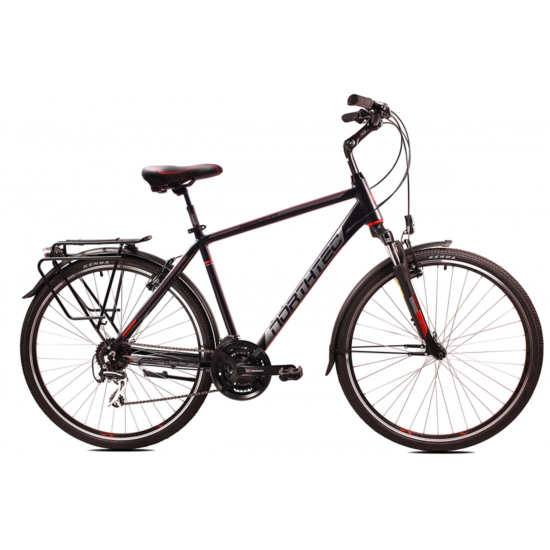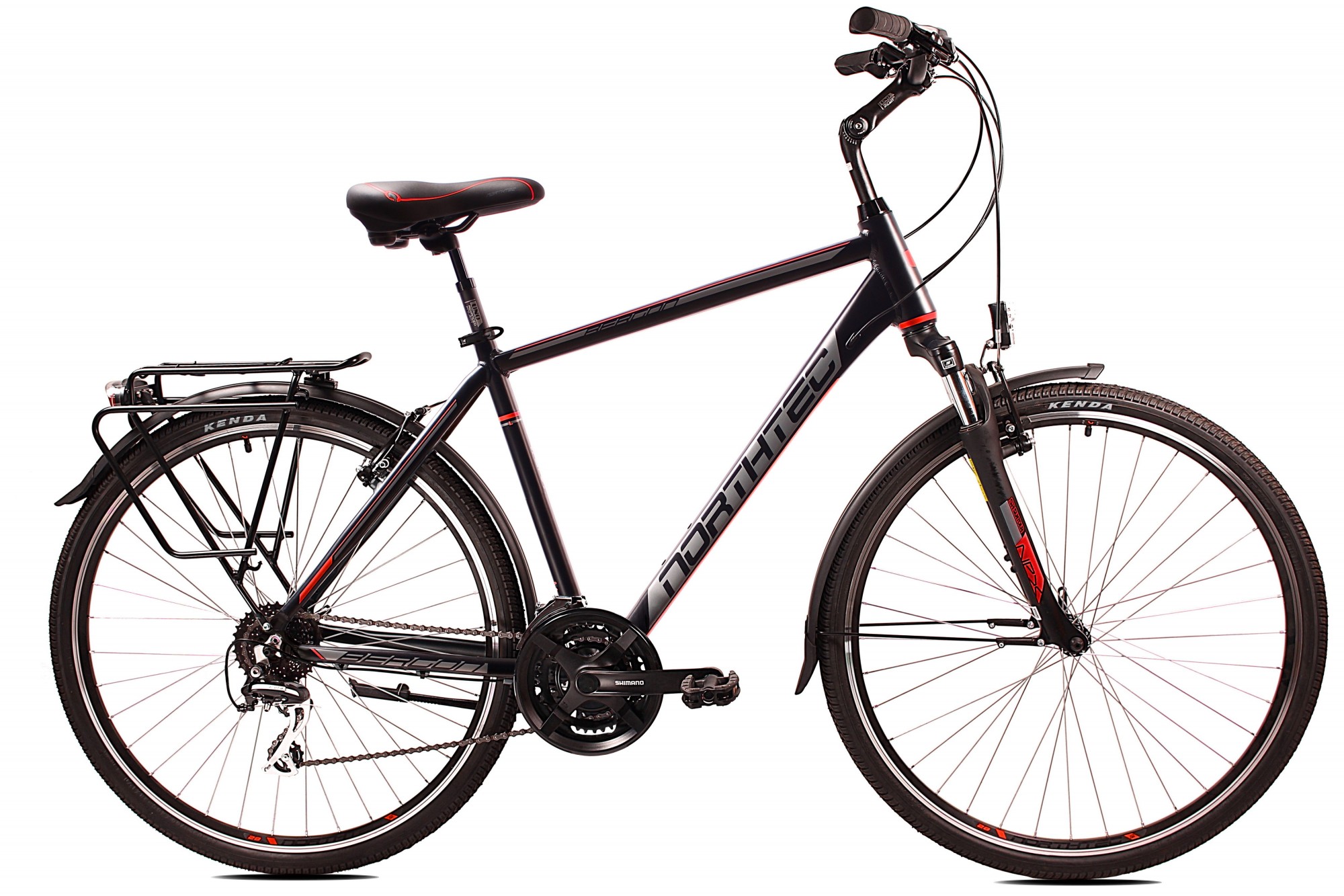 Solidny, wytrzymały rower trekkingowy dla amatorów turystyki rowerowej. Lekka hydroformowana rama aluminiowa o komfortowej geometrii, posiadająca system: Cable Inside Frame. Niezawodna grupa napędowa Acera 3x8. Amortyzator Suntour NEX P 700C 63mm z regulacją skoku. Solidne, wzmacniane koła, zbudowane na piastach Shimano HB TX500, szprychach Sapim. Amortyzowany wspornik siodła, szerokie wygodne siodełko elastomerowe. W podstawowym wyposażeniu zamontowany jest bagażnik aluminiowy, oświetlenie ledowe bateryjne, solidne błotniki SKS oraz podpórka.